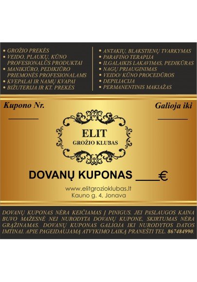Dovanų kuponas galioja visoms prekėms mūsų e-shop'e, fizinėje parduotuvėje bei grožio salono paslaugoms.